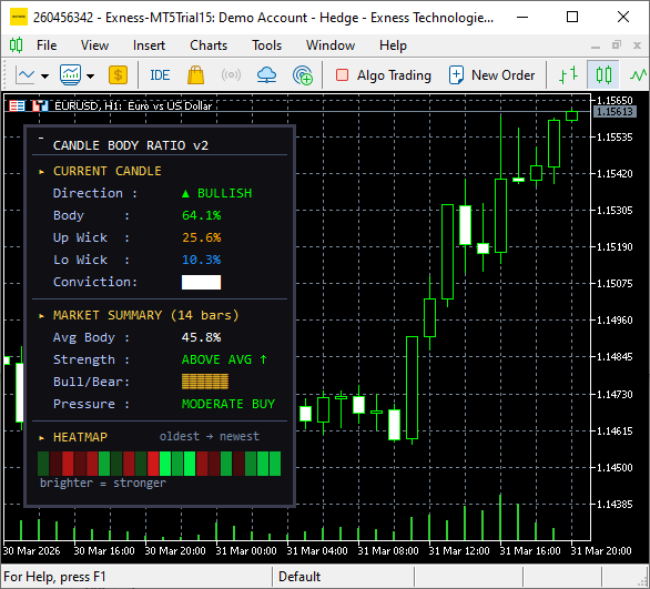 This indicator measures the body-to-wick ratio of each candle and displays a floating dashboard directly on the chart. It tells you at a glance how strong or weak the current candle is, what the average body ratio looks like over a chosen lookback period, and whether bulls or bears have been dominant. A color-coded heatmap strip shows the last N candles ranked by body strength, where brighter color means stronger conviction.