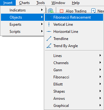 En ouvrant MetaTrader 5, naviguez dans l'onglet Insertion --> Objets --> Retracement de Fibonacci.