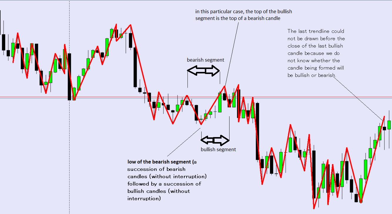A bearish segment is defined as: a succession (of at least one) of bearish candles (without interruption) followed by a succession (of at least one) of bullish candles (without interruption). Note that bullish candles are included in the segment. We then determine the low point of this segment. (It is therefore entirely possible that this low point is the bottom of a bullish candle.)