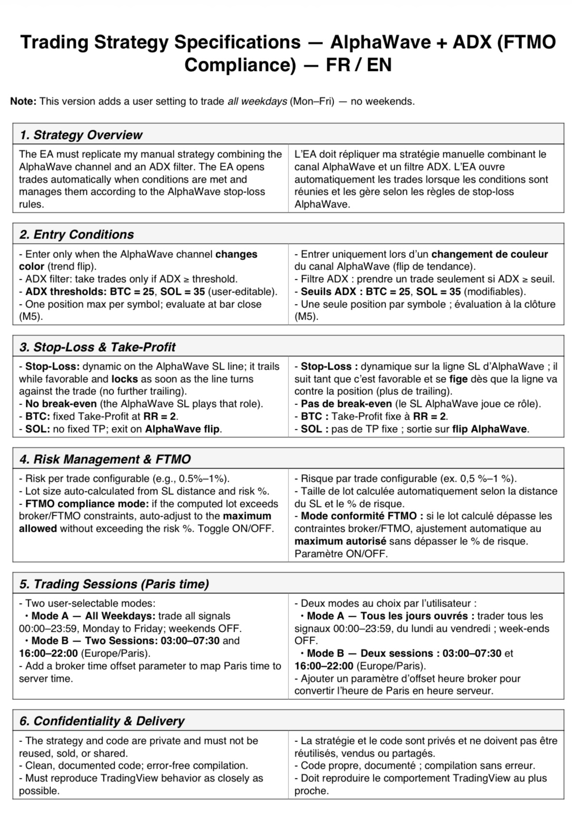 Scope: AlphaWave (dynamic stop logic) + ADX filter with thresholds per asset (BTC=25, SOL=35), risk-based position sizing, session filters (all trades except weekends + configurable time windows), BTC TP at RR=2, SOL exit via AlphaWave stop only, no BE, FTMO-safe lot/SL validation.