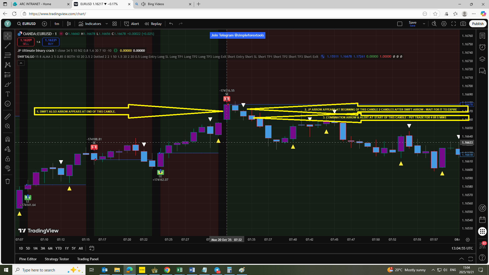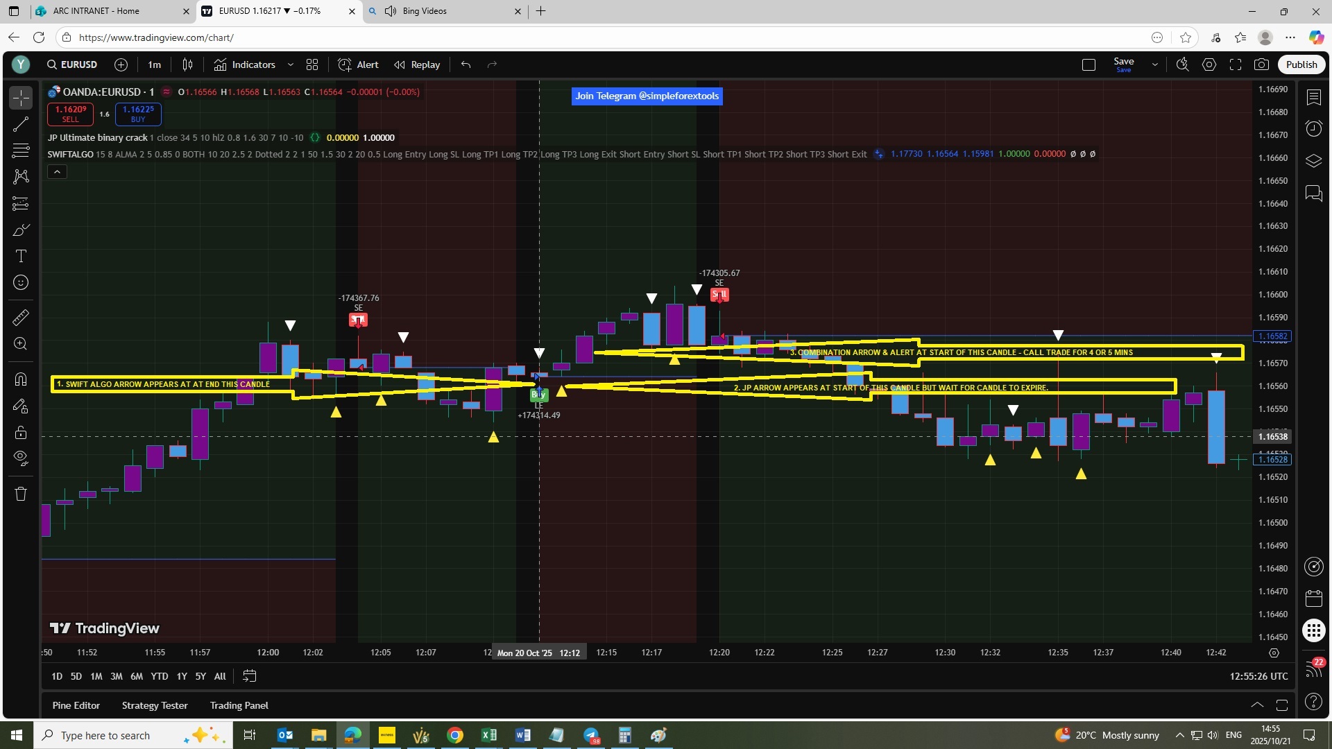 - Sniper arrow appears ON THE SAME CANDLE where Swift Algo arrow appeared. VERY IMPORTANT HERE:WE SHOULD WAIT FOR THAT CANDLE TO EXPIRE TO CONFIRM THAT BOTH APPEARED IN THE SAME CANDLE AND THEY ARE INTACT - A COMBINATION ARROW AND ALERT WHICH SHOULD TRIGGER A TRADE SHOULD APPEAR ON THE NEXT CANDLE (CONFLUENCE OF THE SWIFT ALGO ARROW AND THE Sniper arrow IN THE SAME CANDLE).