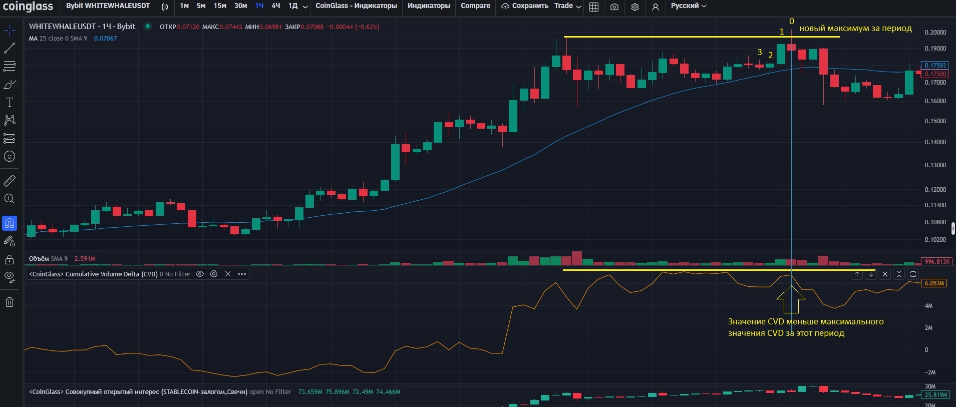 Для hi значений: цена стала максимальная за "период". CVD меньше максимального значения за "период".