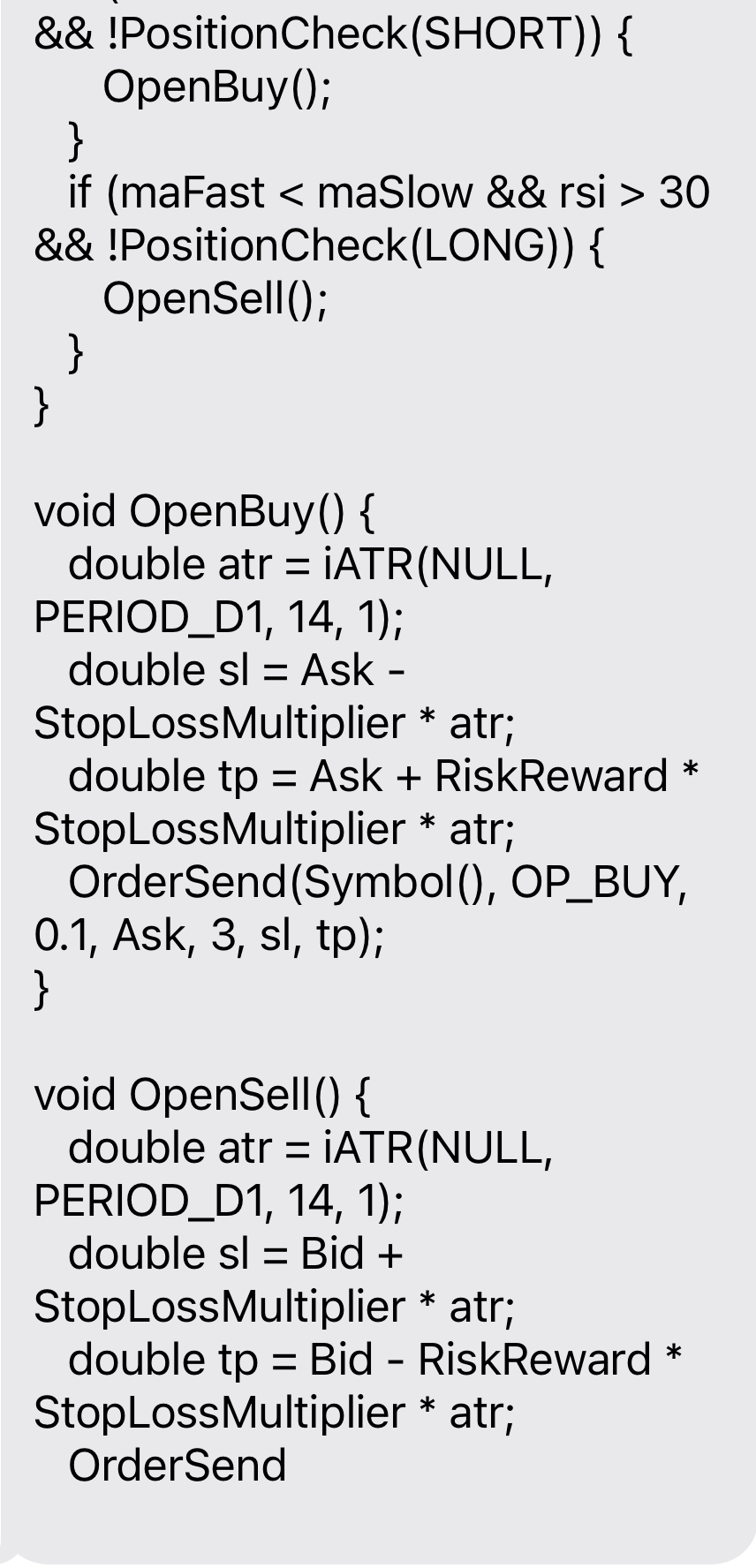 if (maFast < maSlow && rsi > 30 && !PositionCheck(LONG)) {