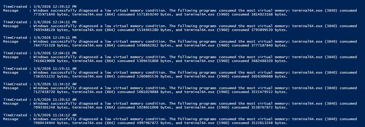 Restarting the terminals temporarily restores normal behaviour, which suggests cumulative resource or memory growth during runtime.