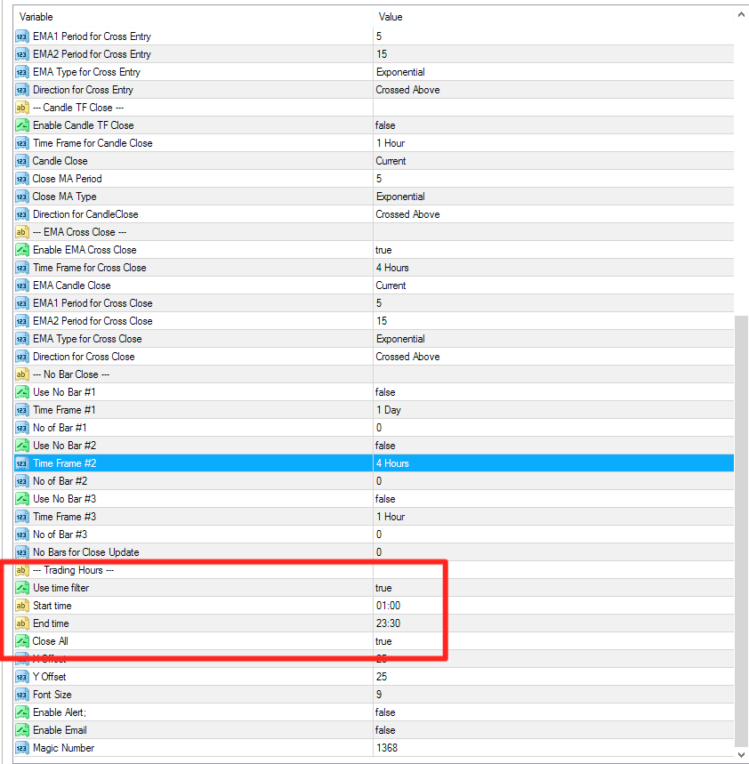 3. It allows time time controlled trading and it closes trades when any of the following occur (No consecutive long or short bars, bar above or below EMA or EMA cross.