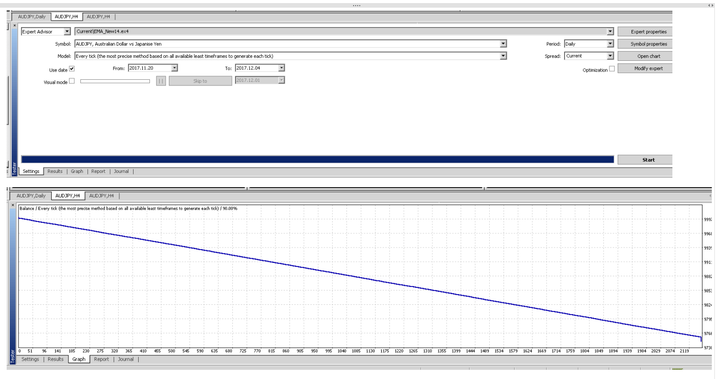 1. Entries on the basis where a trade is open when the current bar both rises above/below the EMA AND the short EMA is above/below the large EMA is not working. See highlighted section in screenshot 1.