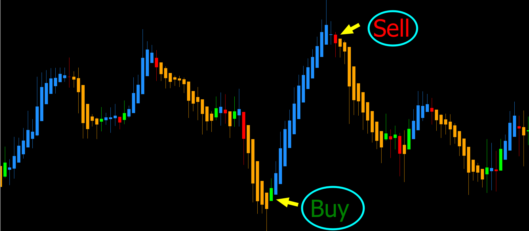 Bougies Heikin Ashi pures, tracées par l’indicateur (pas les bougies par défaut).
