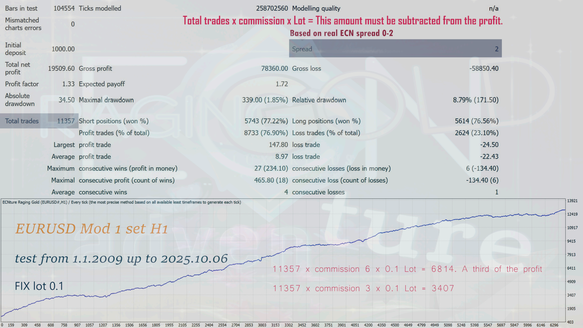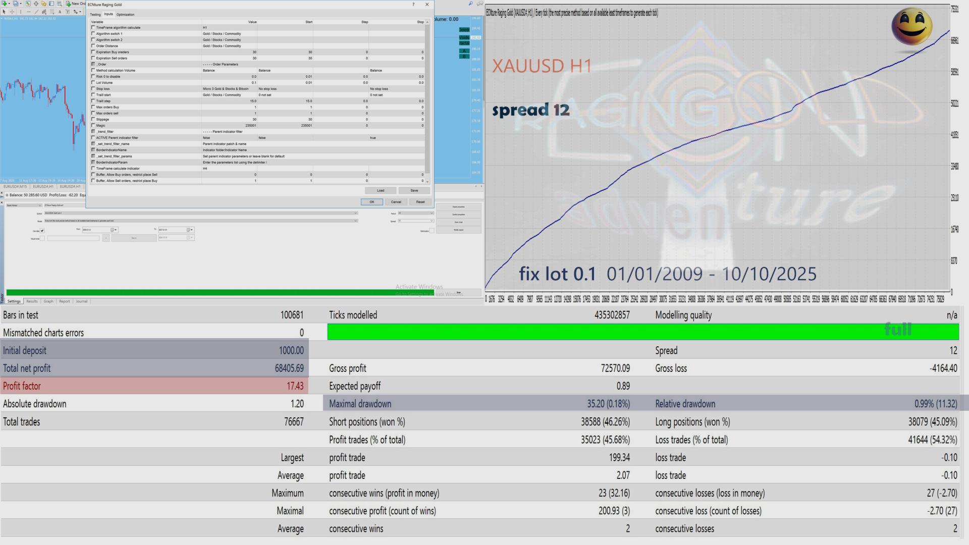 - Currency. My new parameters pass the EURUSD/GBPUSD test with good growth, again proving the algorithm's versatility, but a spread of 2x without commissions is unrealistic. I'm keeping my old EURUSD settings in the bot, which were tested about 5-6 years ago (since 2009), along with several new modifications. However, according to tests, there may be a lull in growth. Risk trading is unlikely to wipe out the deposit, but you should be prepared to wait. Ideally, start the account and leave it for two years or more. By the way, even with gold, a long test can see a drawdown of about a month from the last peak of growth, but the lower the commissions and spreads, the less losses and faster the growth.