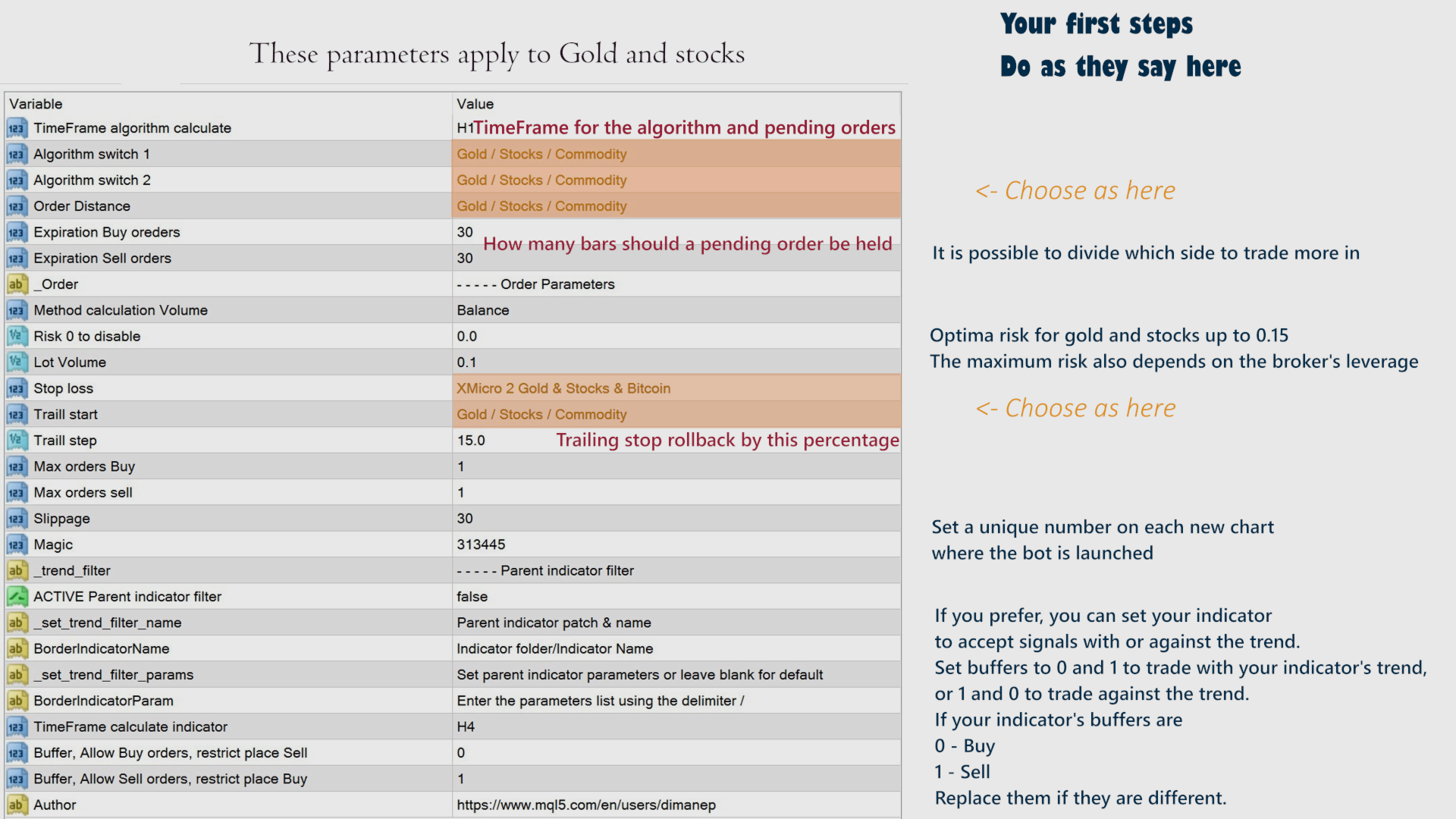 The settings have been simplified. You can change parameters using drop-down menus. Watch the video; you can see how to launch the strategy on gold (XAUUSD) right from the start. Other parameters are named according to trading instruments. You can test them out.