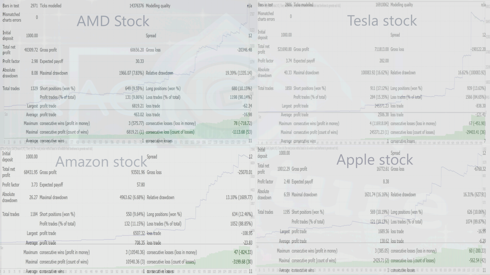 The stars of fate led me to create a trading robot for gold. Specifically, gold. It's not just constant testing, research, calculations, and lengthy development. This is a model that has come close to the ideals of stable gold trading over time, relying more on back testing than just a simple back test. The algorithm plays a key role here, proving its effectiveness on: Currencies – EURUSD GBPUSD Stocks – Apple, AMD, Amazon, Boeing, Broadcom, Chevron, Citigroup, Google, Home Depot, IBM, JP Morgan, Nike, NVDA, QUALCOMM, Starbucks, Tesla, U.S. Health (approximately 80% of those tested). Many of these have an average spread lower than the one used for testing.