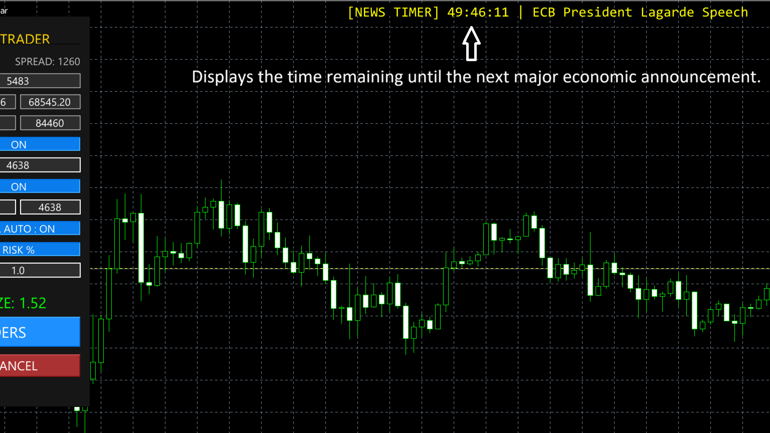 Affiche un compte à rebours en temps réel pour le prochain événement économique majeur directement sur votre graphique. Il calcule automatiquement la différence entre l'heure du serveur et l'heure locale pour une précision absolue.