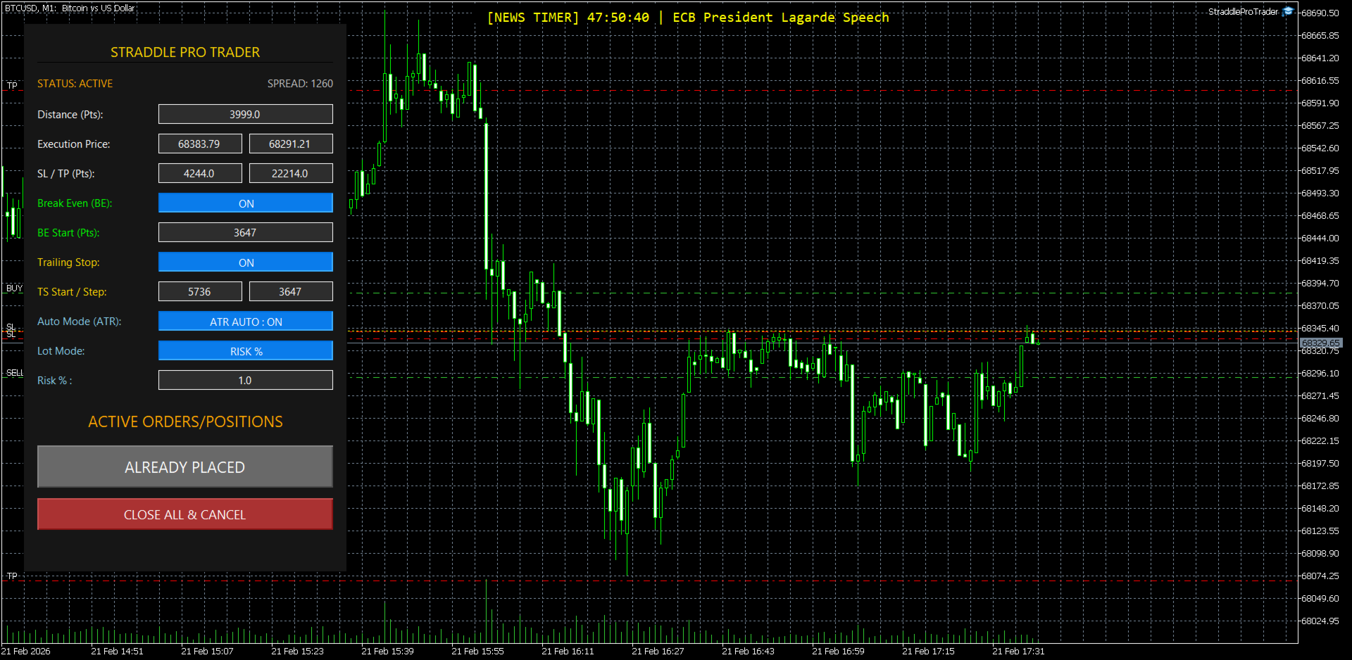 Straddle Pro ne s'active que lorsque le trader clique sur le bouton "PLACE ORDERS" quelques secondes avant la publication. Cela garantit que le système reste inactif pendant les périodes non pertinentes et n'intervient que lors des opportunités à haute probabilité.