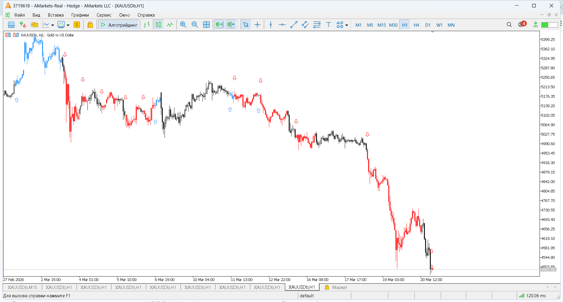 Arrows appear only on the first bar of a new signal (no repetition)