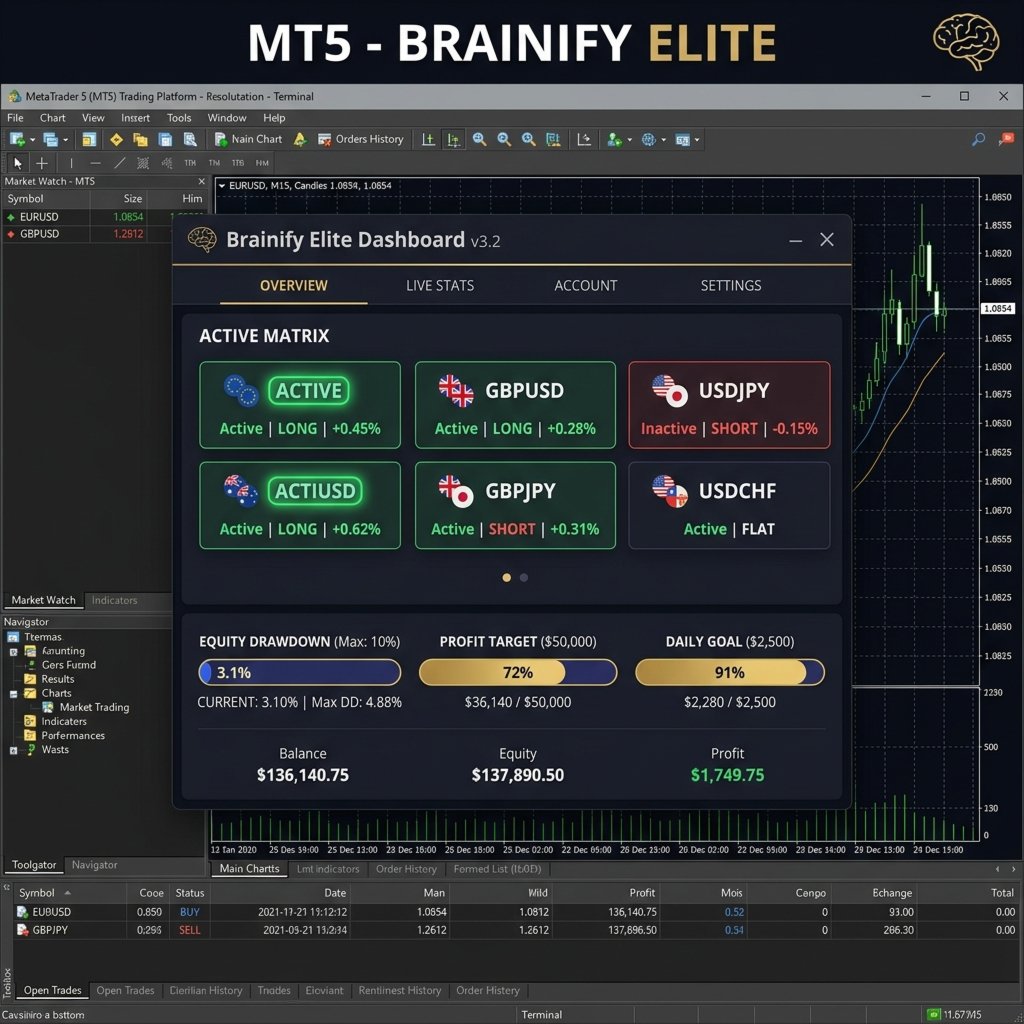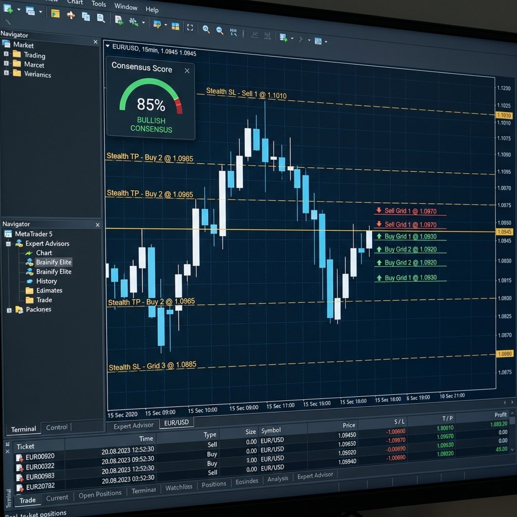Ressentez la sécurité d'un système qui refuse de faire des suppositions. Brainify Elite utilise un moteur de consensus unifié qui écoute le pouls du marché à travers les filtres MACD, RSI et volatilité. Il n'agit que lorsque les signaux sont forts et clairs, vous permettant de voir les résultats d'une confluence de niveau professionnel en temps réel.
