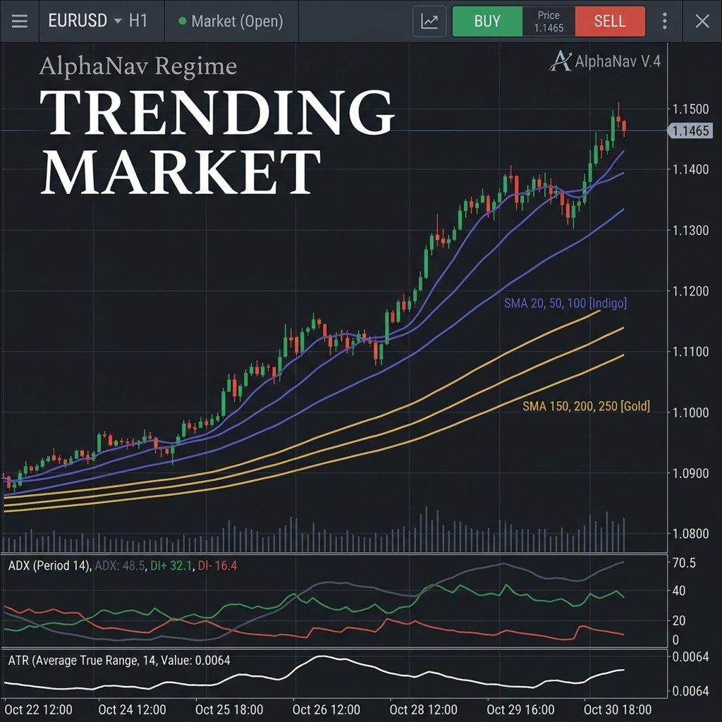 Le marché est vivant, et vous méritez un système qui respire avec lui. Notre détection de régime AlphaNav détecte automatiquement si le marché est en tendance ou en range. Il change sa personnalité en un instant, vous garantissant d'être toujours du bon côté de l'élan.