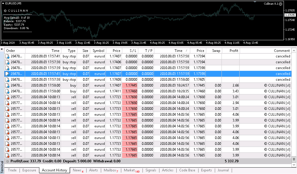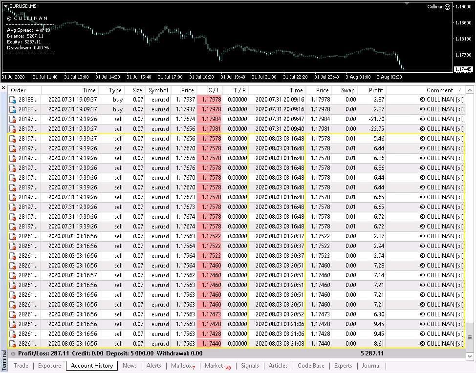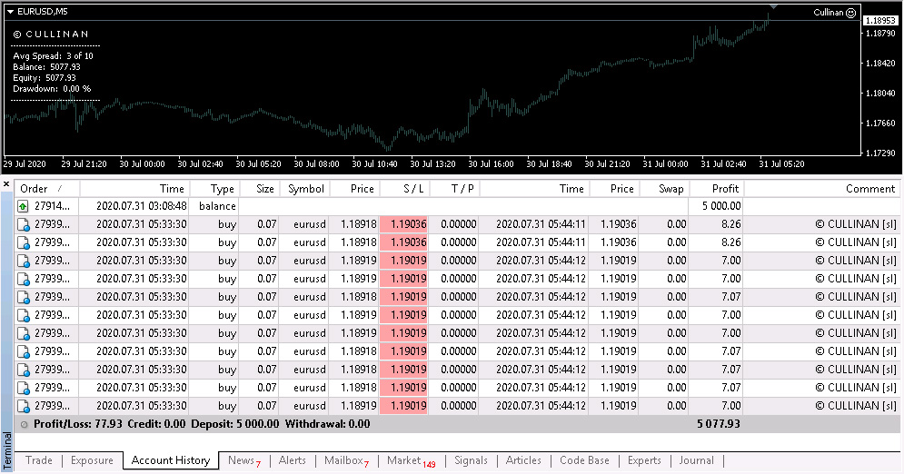 Cullinan's strategy is to use multiple orders for 1 signal, when those orders become bad positions, the EA will partially exit to reduce account risk, it will calculate the profitability of the new signals, can balance losses with pending orders and calculate the number of orders to exit. As such it will maintain the account at low risk and steady growth. For example there are 10 bad orders, and then 10 take profit orders, of which 10 TP orders = 2 orders SL, then it will get 2 orders from bad positions, and continue until bad positions exit. market. This seems complicated to describe in detail.