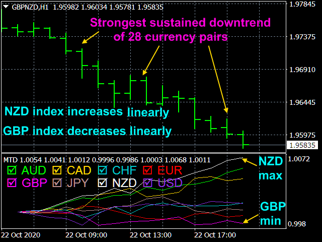 Multicurrency Trend Detector indicator allows you to immediately and on one chart on a selected time interval (extending from a zero bar to a bar set in the settings by the value horizon) determine the presence, direction and strength of trends in all major currencies, as well as assess the reliability of these trends.