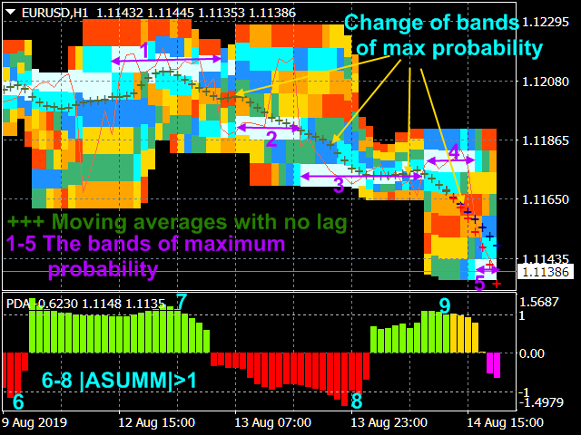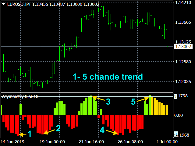 Asummetry indicator allows you to predict the beginning of a change in the direction of trends, long before their visual appearance on the price chart.
