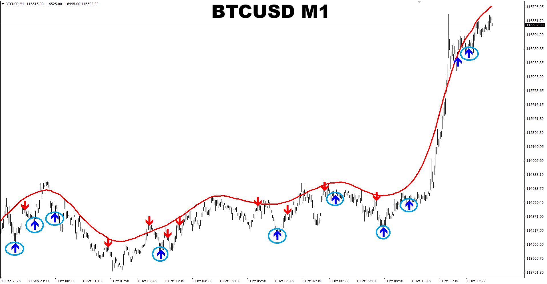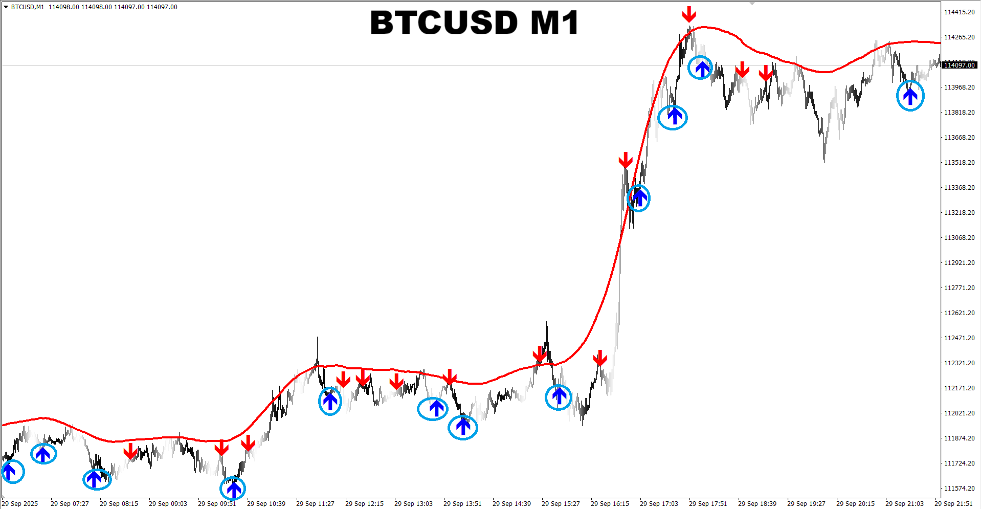 M1 SNIPER system. BTCUSD M1. Recent signals (put in circles) for trading towards Dynamic SR line. Trading towards the Dynamic SR line is the safest way to trade M1 charts using the M1 SNIPER system as in this case the Dynamic SR line works like a magnet and pulls the price towards itself.