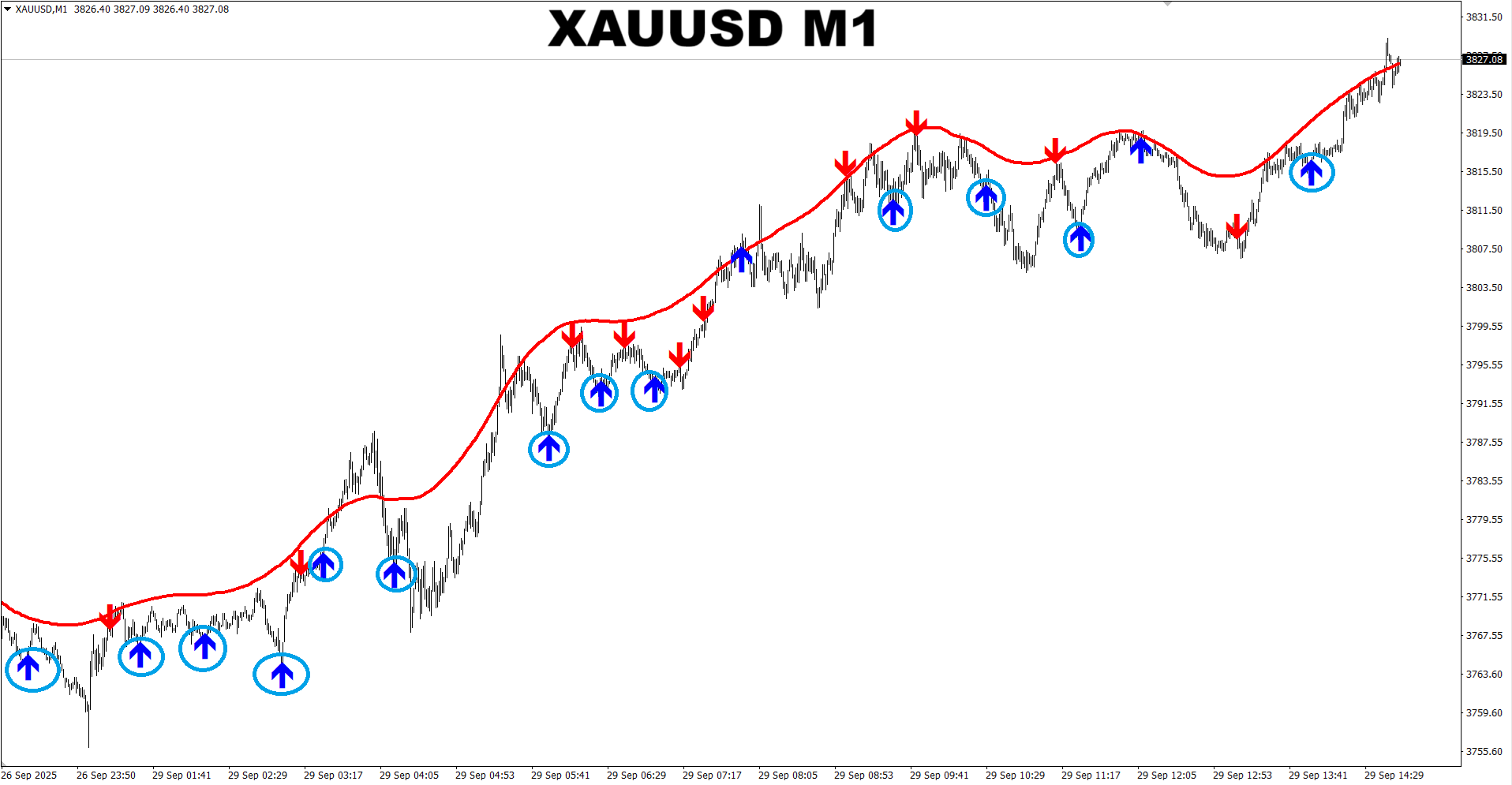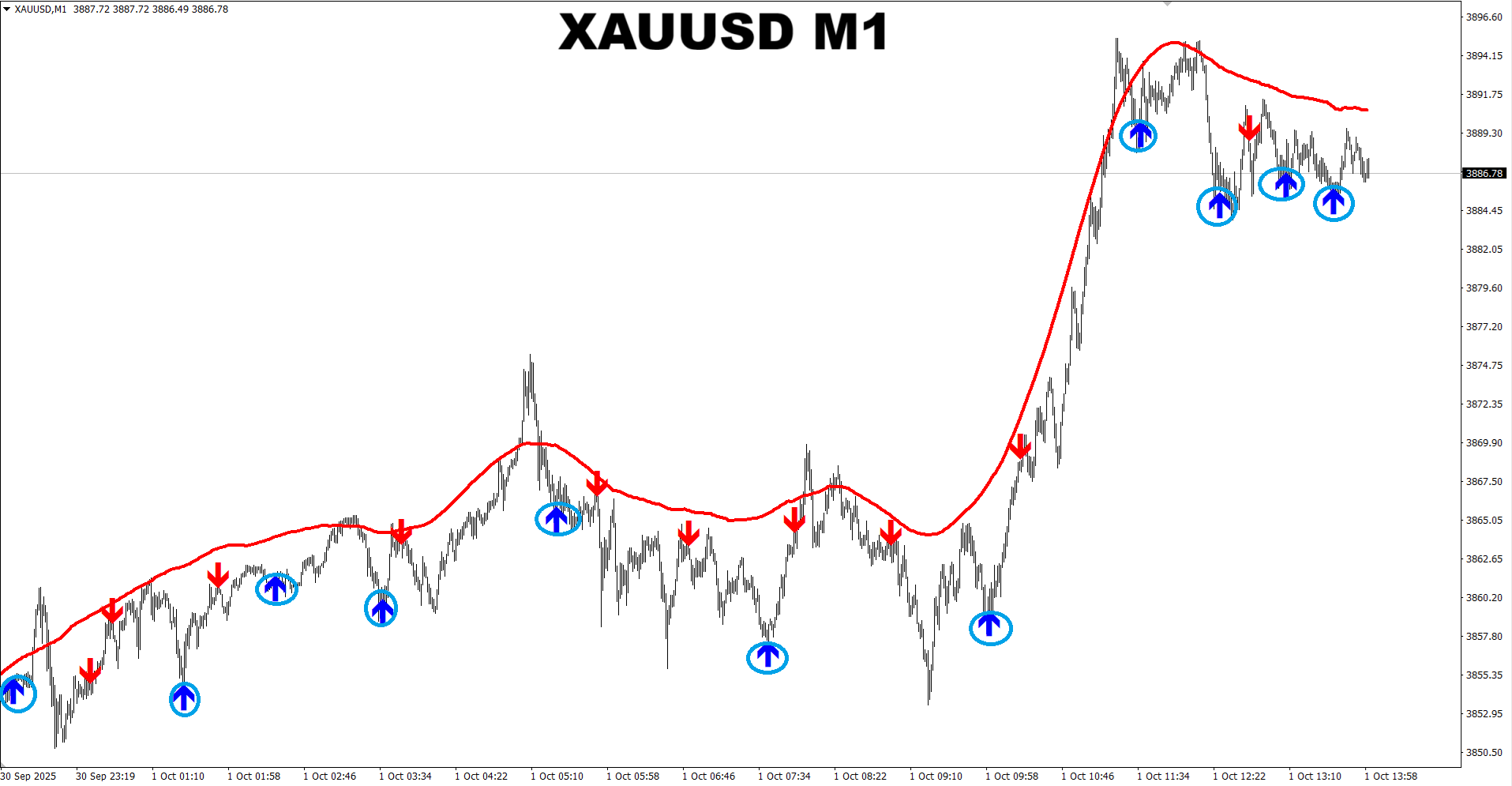 M1 SNIPER system. XAUUSD M1. Recent valid signals (put in circles) for trading towards Dynamic SR line. Signals which are at the line or very close to it are not valid. Trading towards the Dynamic SR line is the safest way to trade M1 charts using the M1 SNIPER system as in this case the Dynamic SR line works like a magnet and pulls the price towards itself.