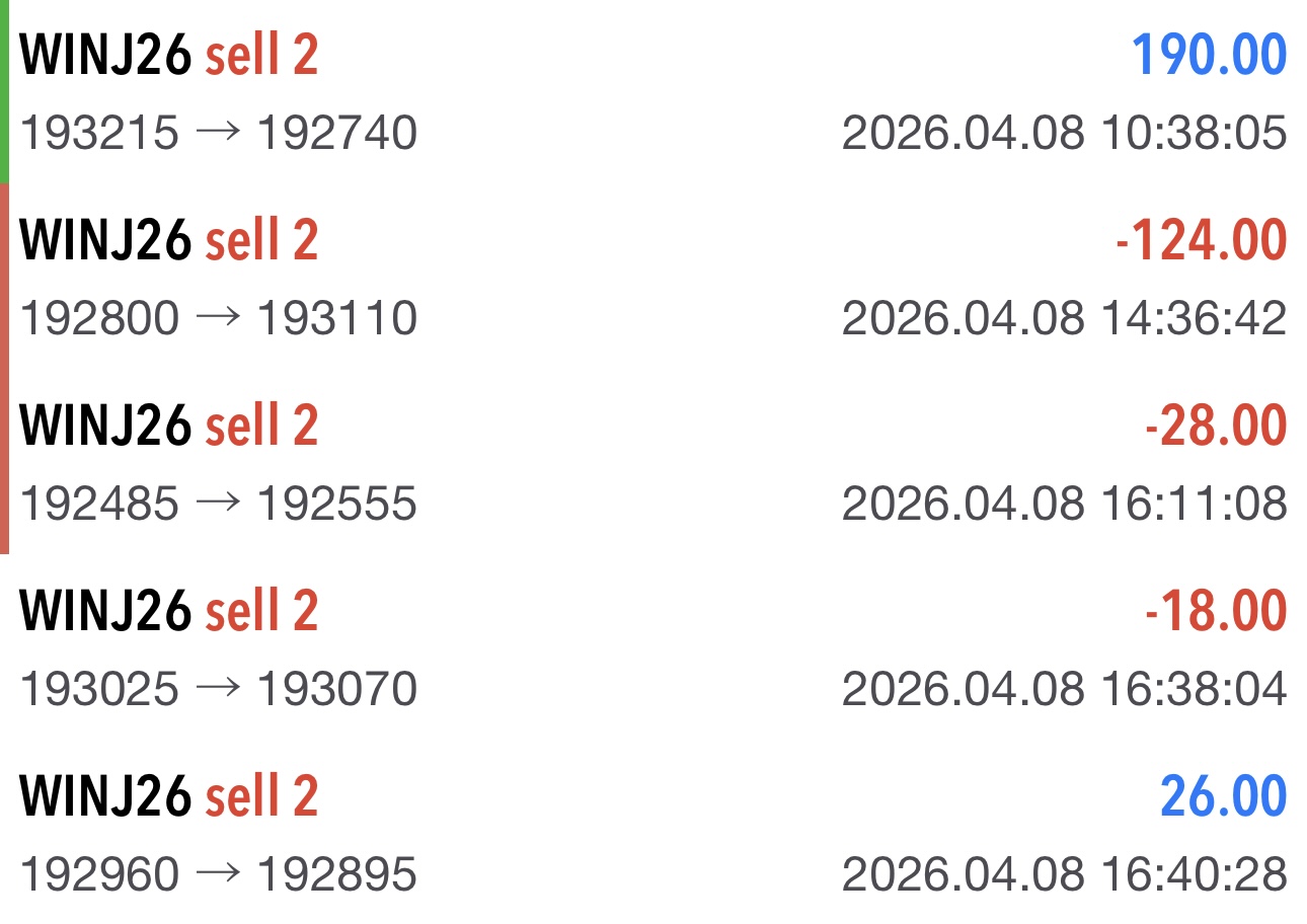 Consistency and Risk Management: Solid Green Day on WINJ26 (04/09)! Another session of excellent results from our Expert Advisor running on the Brazilian Mini Index (B3). Even on a day with a heavy news flow and market volatility, the algorithm showed robustness to ride the best trends and technical discipline to cut losses quickly when the market shifted. Session Summary (04/09): • Asset: WINJ26 (Brazilian Mini Index) • Lot Size: 3 Contracts • Trades: 4 • Win Rate: 75% (3 Wins / 1 Loss) • Net