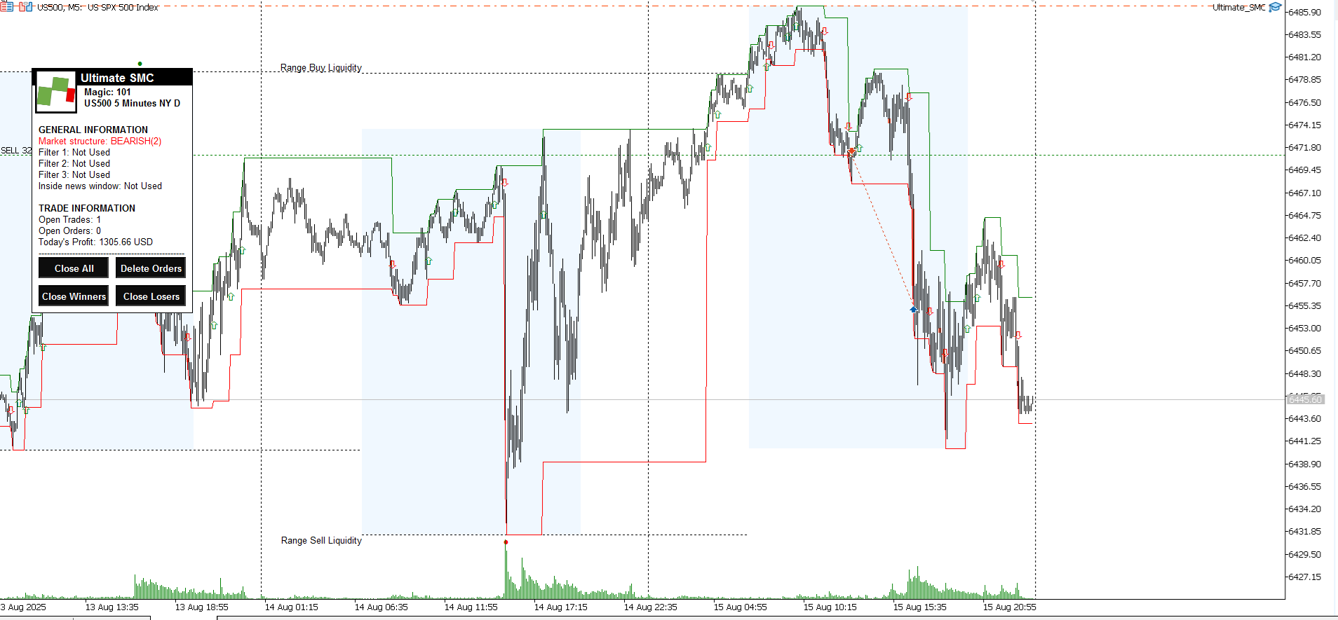 Yesterday, Ultimate SMC delivered another great trade on US500 (M5 NY session) – partially closed in profit, securing $1,305.66 USD for the day ✅.