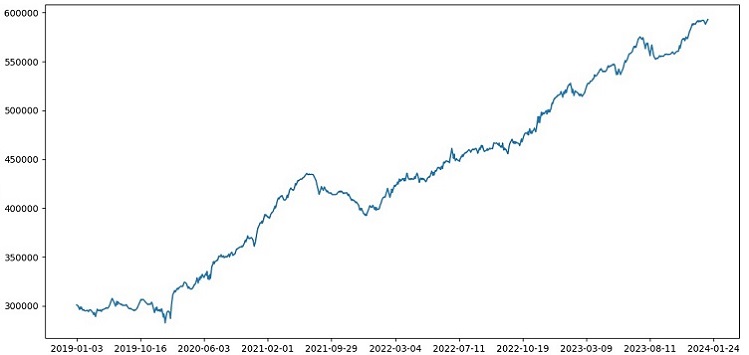 La funzione riceve un modello, i dati di prova, il markup e il saldo iniziale. Il trading è simulato utilizzando le previsioni del modello: long a 1, short a 0. Se il profitto supera il markup, la posizione viene chiusa e il profitto viene aggiunto al saldo.