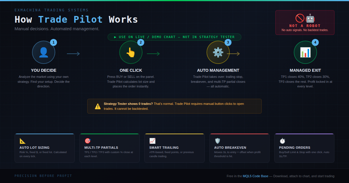 MetaTrader’s built-in order management is stuck in 2005. No partial take-profits. No automatic breakeven. A trailing stop that only works in fixed points. Every time you want to scale out, you’re manually splitting positions and calculating lots.