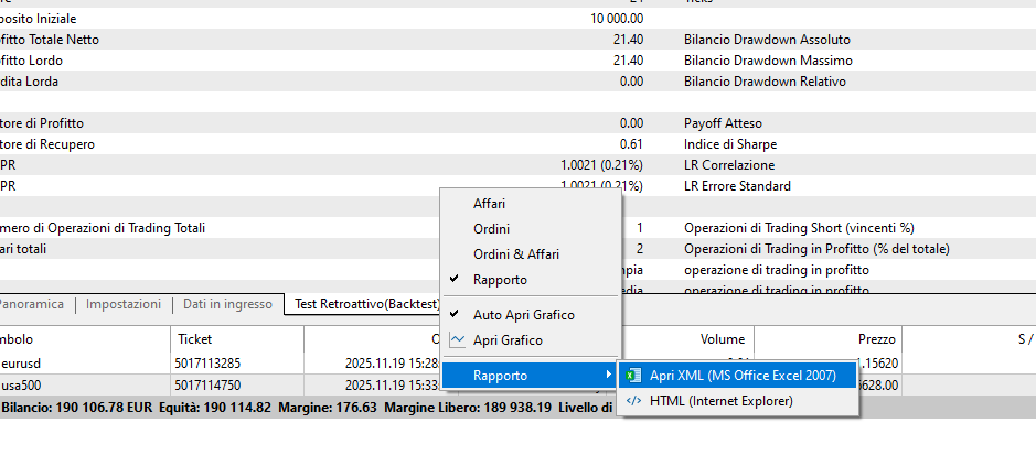 Avviene una chiusura improvvisa della piattaforma a seguito della richiesta di esportazione del report di un backtest di un semplice EA disponibile di default.