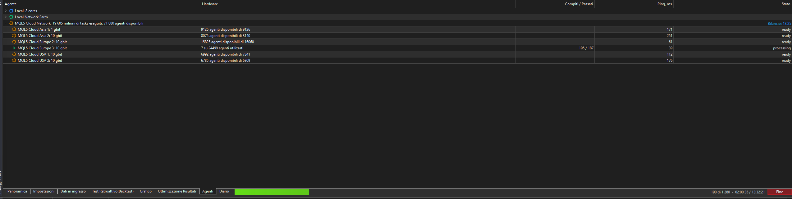 Ciao, quando scelgo di utilizzare l'agoritmo rapido basato sulla genetica con il criterio fattore di recupero max, quando starta il test resta bloccato ad esempio a 190 di 1280 e gli agent cloud non sono stabili tendono ad essere sempre 1 e a volte 65. Se invece provo a fare il test con un criterio diverso ad esempio fattore di profitto max addirittura con piu parametri , il test funziona bene e termina corrattamente. Perche con fattore di recupero max resta fermo? attendo anche 2-3 ore ma comunque assumeo questo comportamento? Resto in attesa di un riscontro. Grazie in anticipo