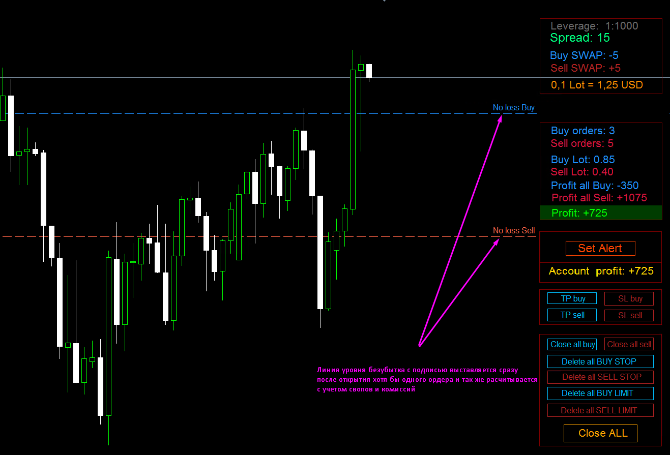 - визуализация безубытка по всем открытым ордерам на инструменте