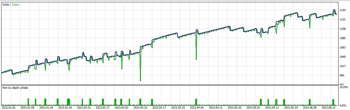 Merci pour le partage de cet EA. J'ai effectué un backtest avec des données entre avril 2021 et juin 2023. Le résultat montre une période où l'équilibre a chuté. J'ai testé deux fois, une fois avec le paramètre par défaut et une autre fois en utilisant le paramètre que vous avez publié ci-dessus.