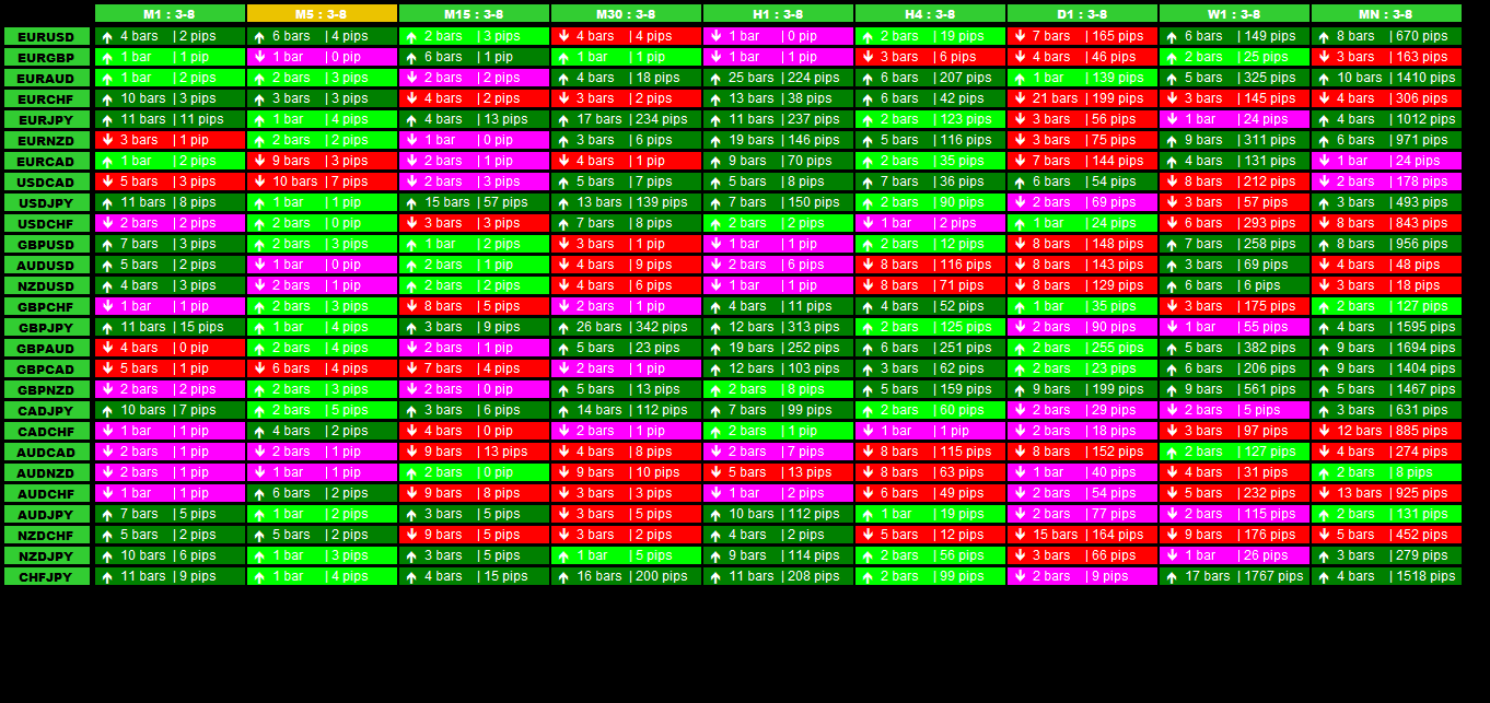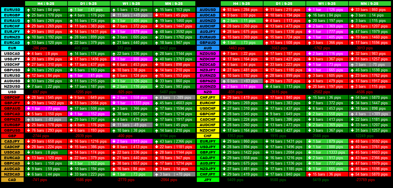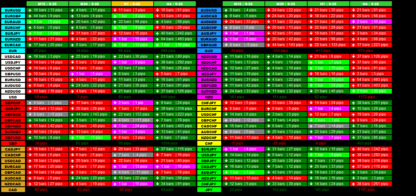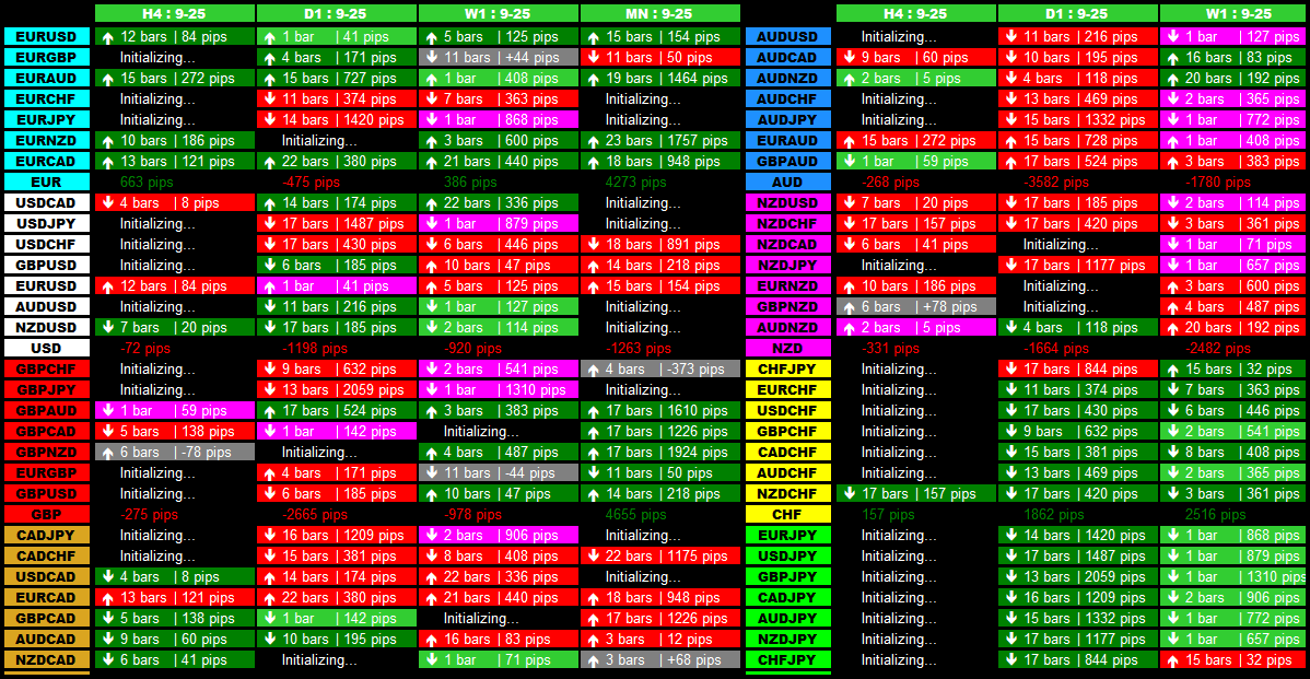 Take a peek at the H1 columns. The dashboard is pointing out a couple of crossover signals. The newest crossovers are standing out with lime and magenta colors. Lime means strong, while magenta signals weakness.