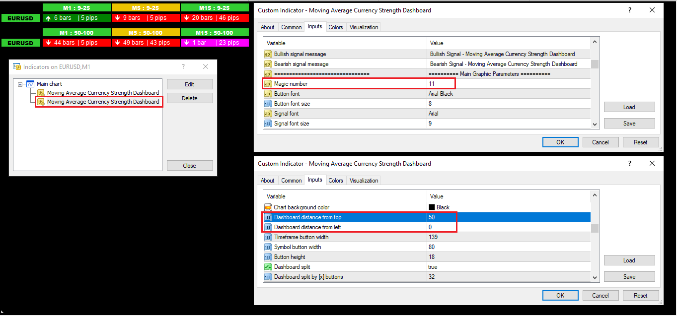 i try this with changing param Black chart for dashboard = FALSE and Magic number different for each instance