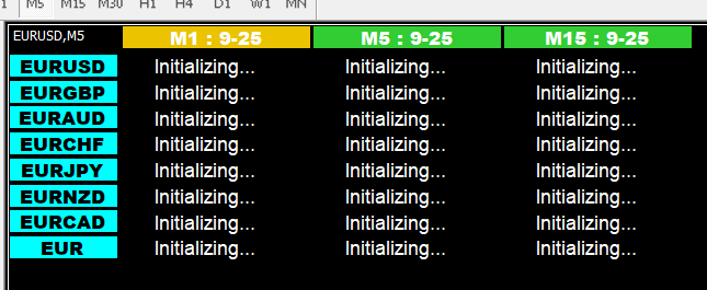 "Initializing" means the indicator can't access enough historical data to calculate moving averages. This typically happens when you first load the indicator onto a chart. To resolve this issue, follow these steps: