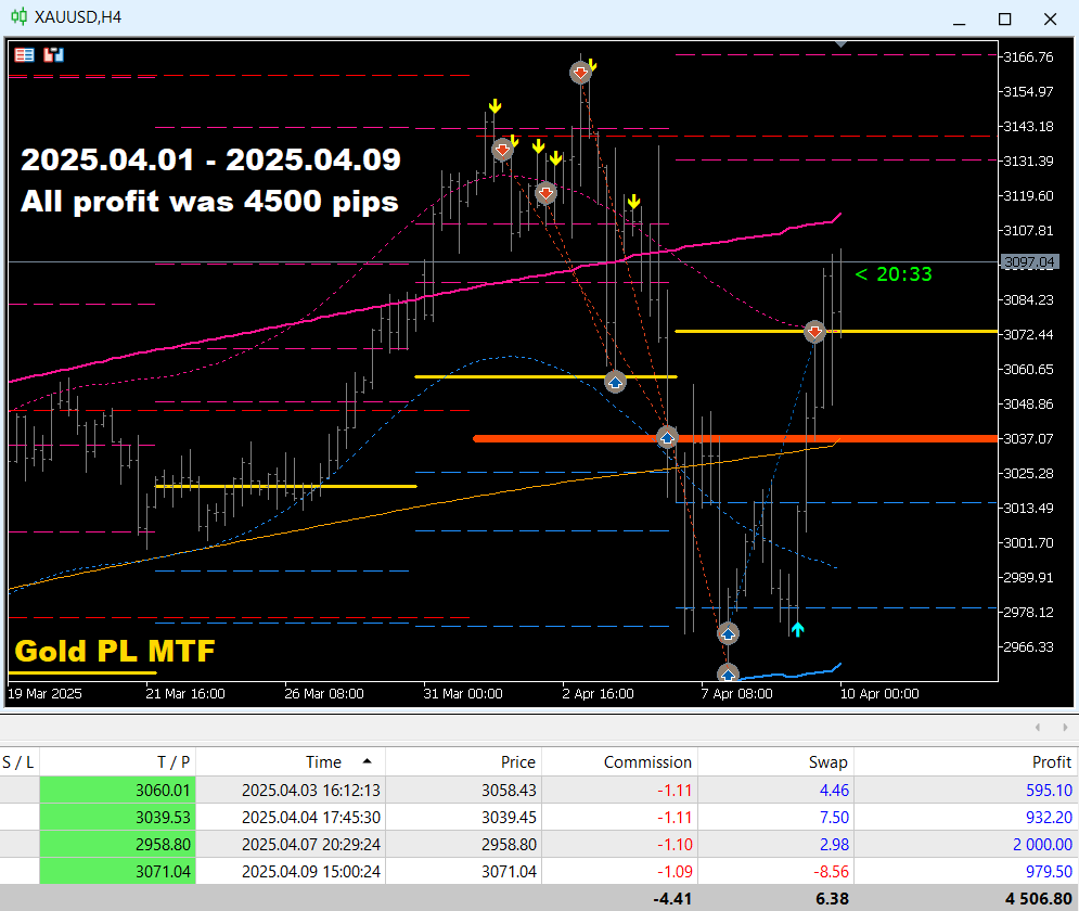 For the trading period 2025.04.01 - 2025.04.09 the all profit by Gold PL MTF indicator was 4500 pips...