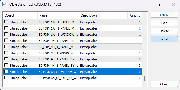 Option 2: Open your charts object list with Ctrl+O and look for a BitMap Label named SIList*** in Window 0 and delete it.