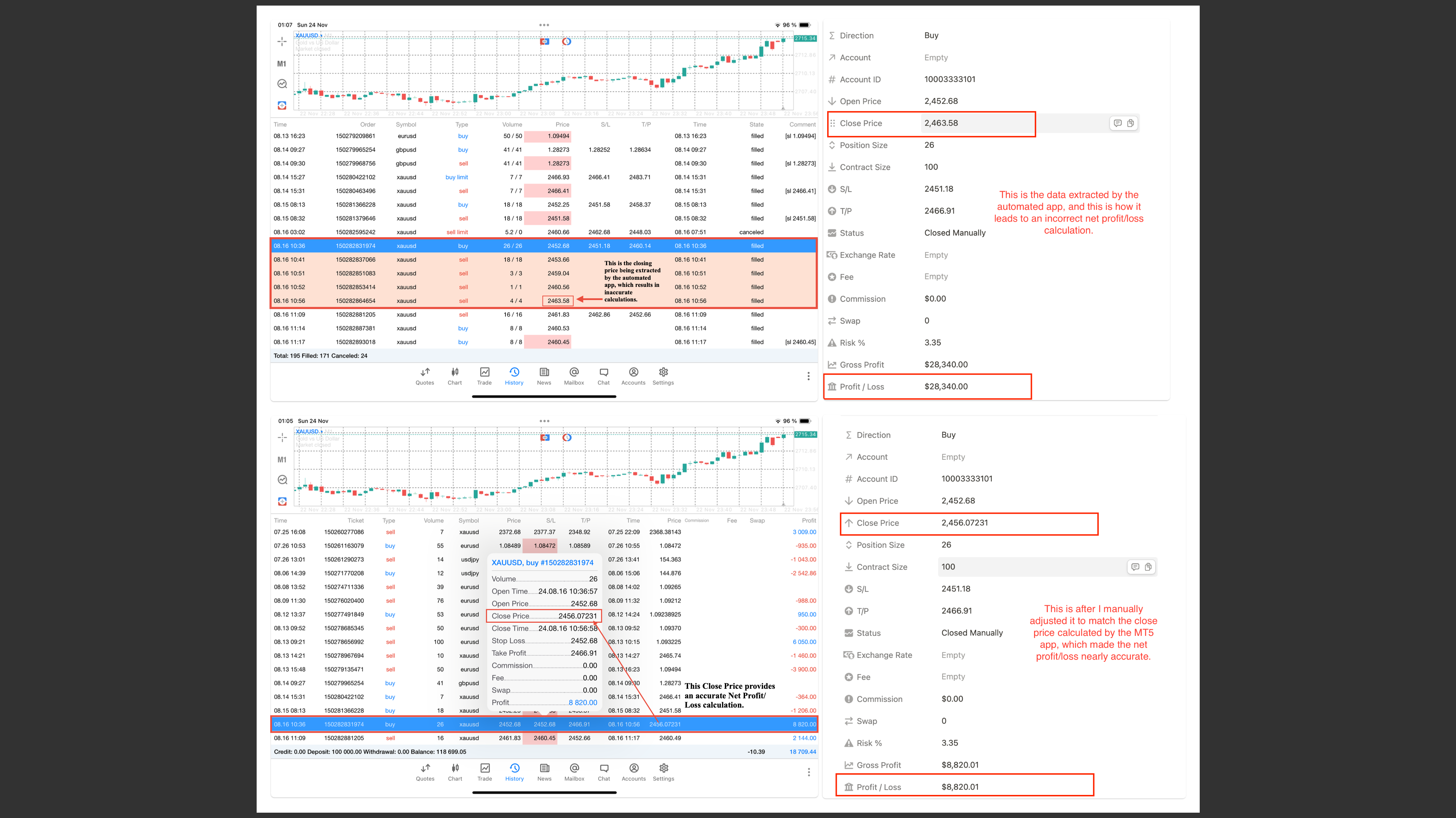 However, I’ve noticed an issue with trades that involve multiple orders, like when I take partials. The app seems to extract the closing price of the last order as the overall closing price (after taking partials), which causes the net profit/loss calculations to be inaccurate. I’ve attached a PDF that explains the situation in more detail, including examples of how this happens and how I manually adjusted it to match the actual profit of the trade, which resulted in more accurate results.