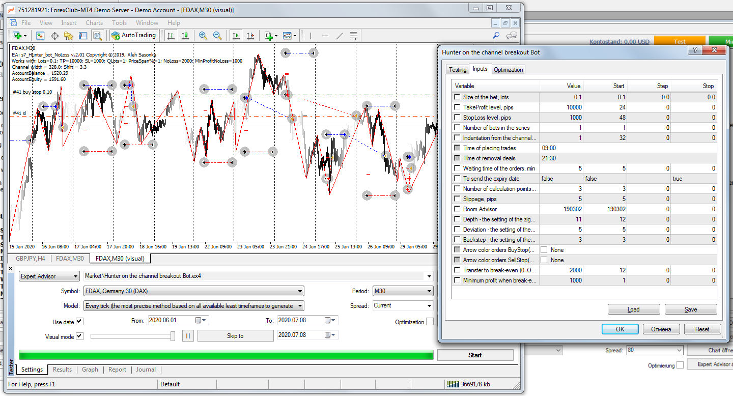 Тестируется новая версия советника "Hunter on the channel breakout Bot NoLoss".