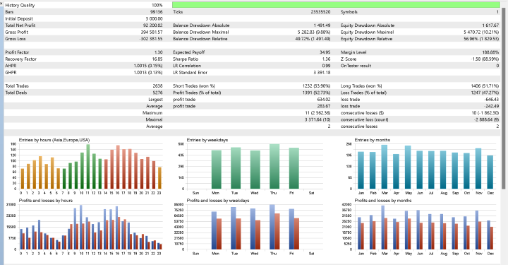 Time-Based Entries: There are 580 entries by hours, showcasing the trading activity throughout different parts of the day. Additionally, 260 entries by weekdays and 435 entries by months reveal variations in trading frequency during the week and year.