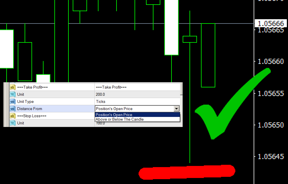 and what means options in "Distance from" how it works with "Position's Open Price" and Above or "Below the candle"