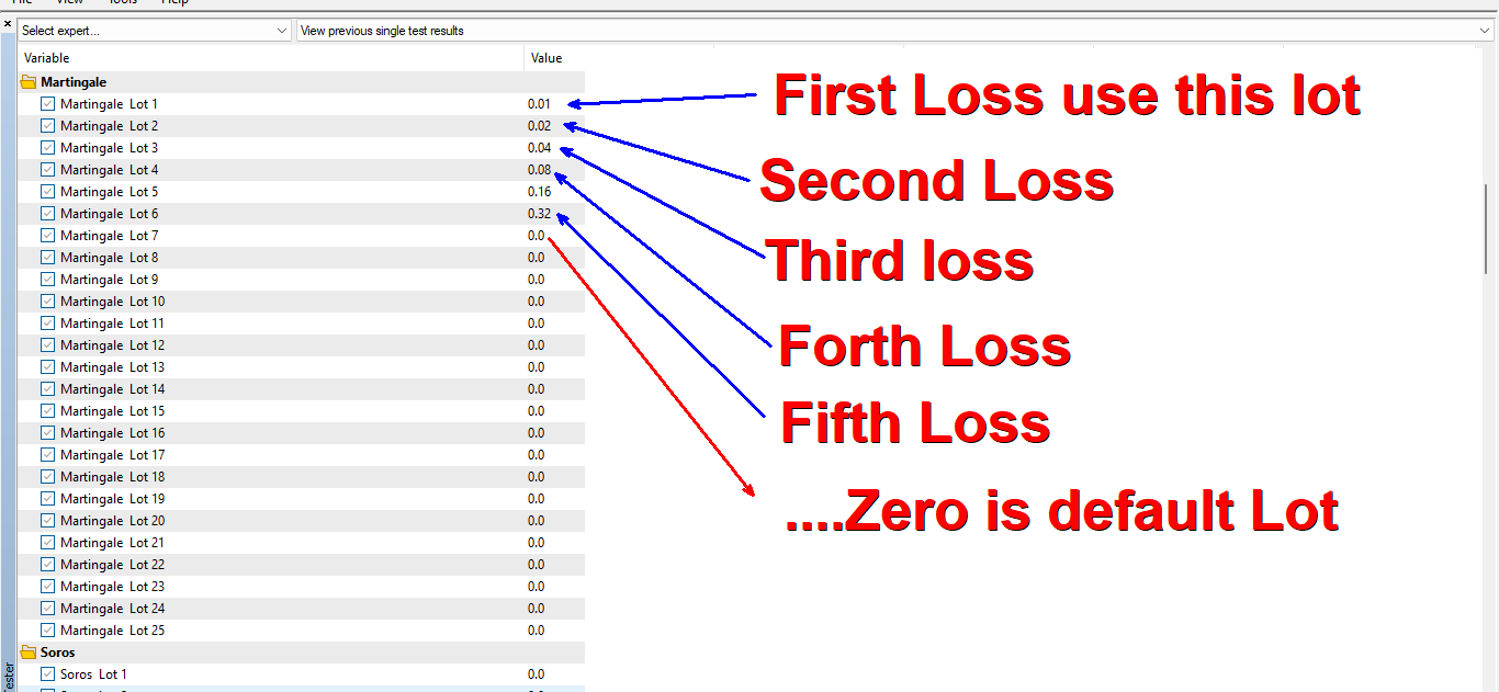 In this example, I'm using 0.01, which means that after the first stop-loss, the next trade will use a lot size of 0.01.