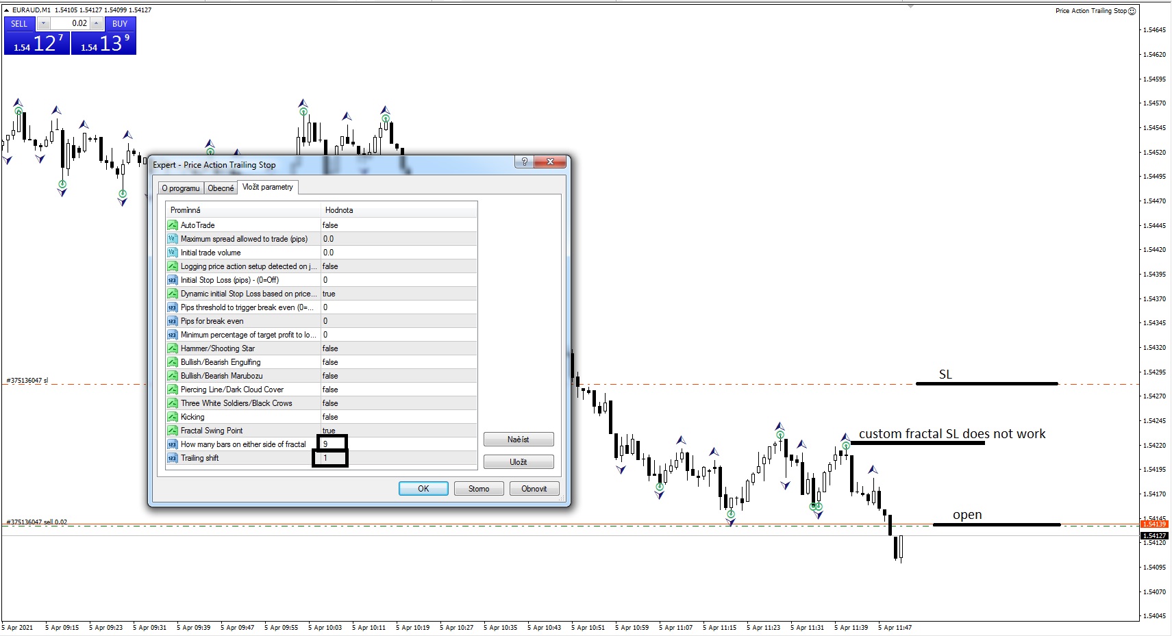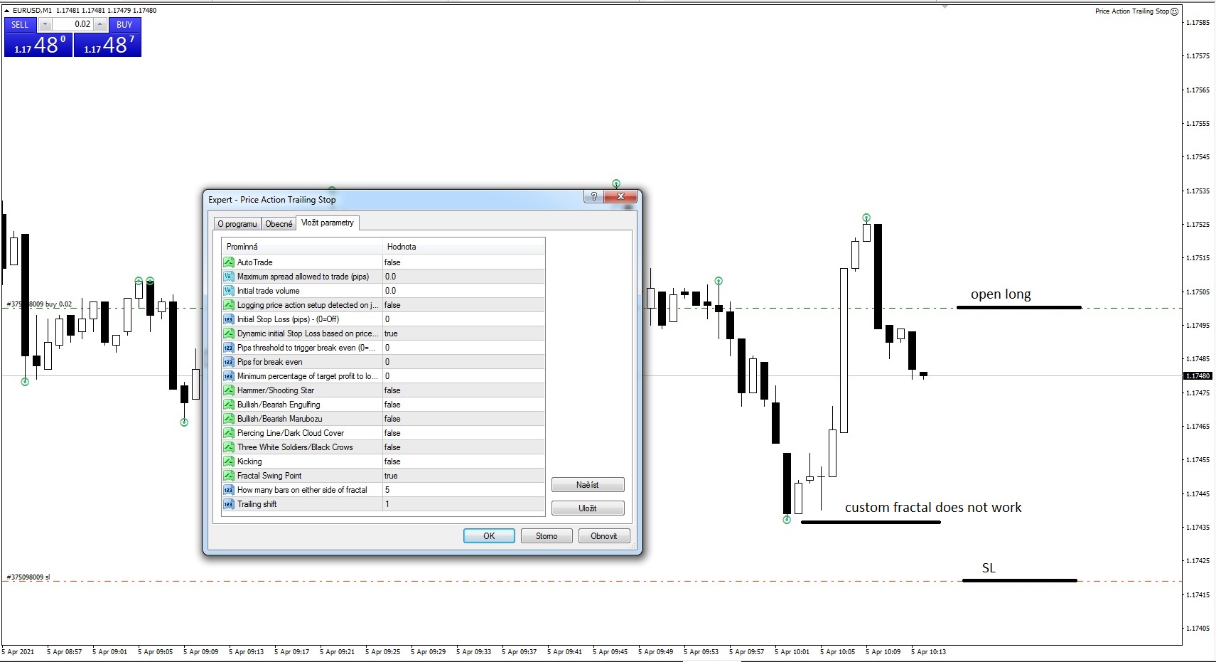 trailing SL does not work. Custom fractal does not set SL. i just need trail stop loss using custom fractals. Please correct it. or I want a refund. EA is not doing anything.,
