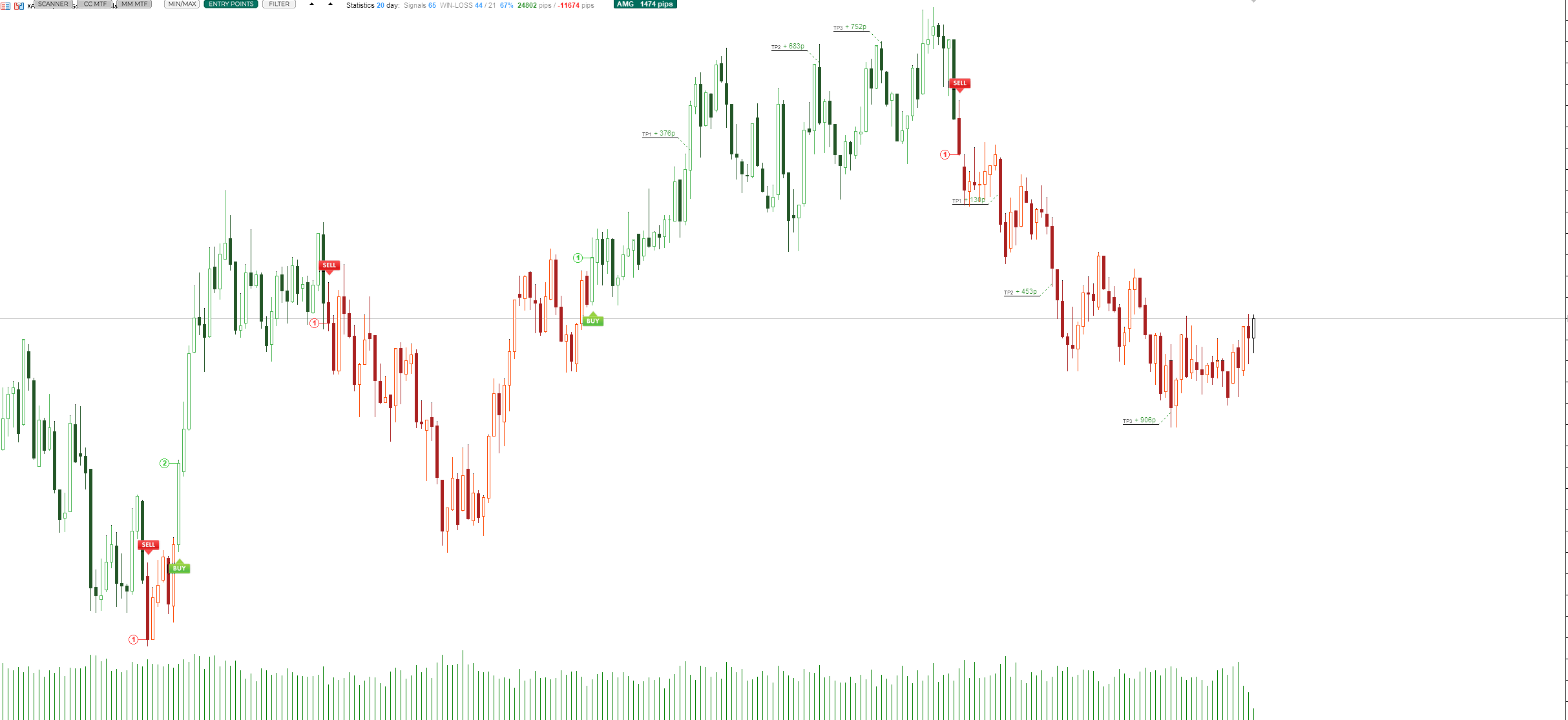 Ho un problema con la visualizzazione che non riesco a risolvere, allego qui uno screenshot. È troppo piccolo e non riesco a leggerlo bene. Voglio imparare tutto su questo indicatore, hai un manuale? o un'impostazione speciale per materie prime, forex, criptovalute, ecc.?