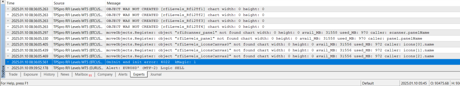 Could you please check this error: 2025.01.10 08:36:05.561 TPSpro RFI Levels MT5 (BTCUSD',M15) OnInit end init error: 4022 kMagic: 1