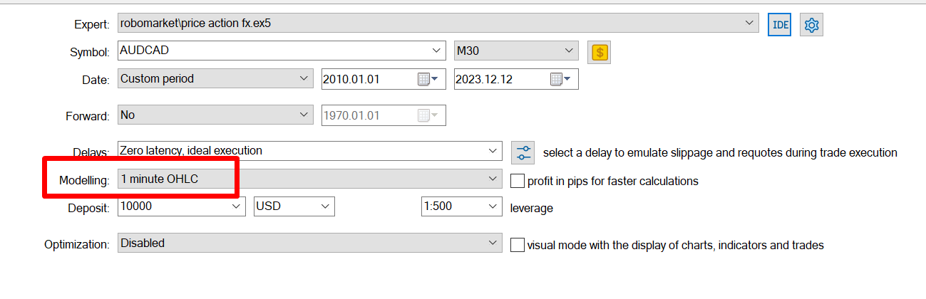 To fast testing use 1 minute OHLC method because EA uses open candle price in the code