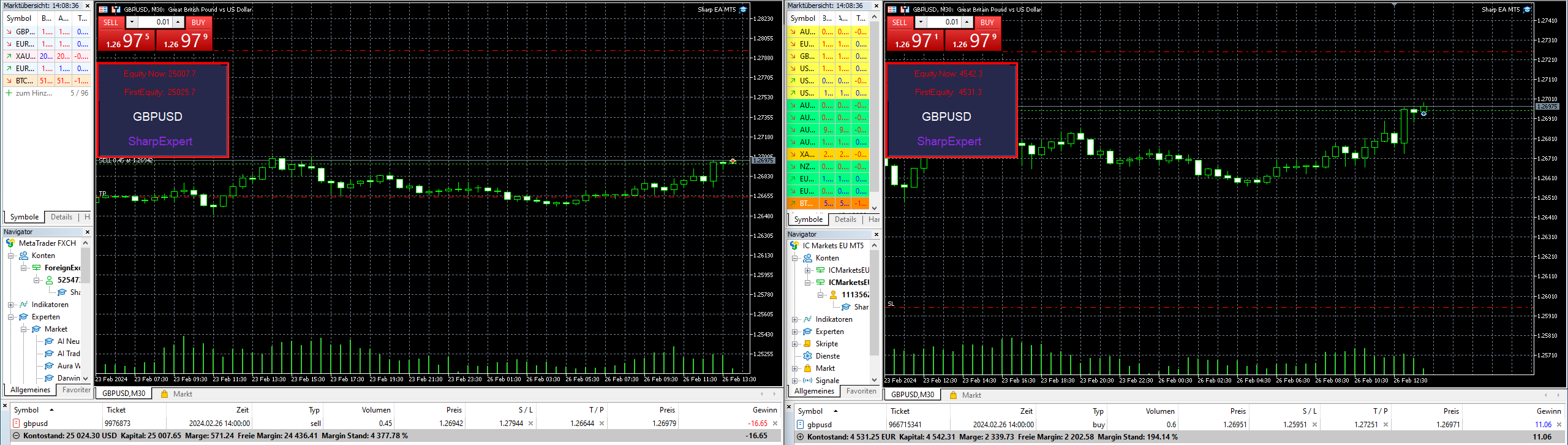 Bro this EA is just weird :D. Pls look at the screenshoot. In Nova (left) it opens a short and in ICmarket (right) it opens a long Trade, at the same time??? Wtf :DDD 100% same settings, it's just different lotsize, no other trade open. I still like the results but it's just weird :D. U can see the screenshot. In case anyone doens't believe this bot: I have 6/6 Hits! It's just nice!