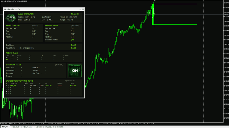 ORB Revolution è un Expert Advisor professionale di tipo Opening Range Breakout (ORB) per MetaTrader 5, progettato per un trading automatizzato disciplinato e con controllo del rischio. Costruito secondo standard istituzionali, questo sistema dà priorità alla protezione del capitale, a un’esecuzione ripetibile e a una logica decisionale trasparente — ideale per trader seri e per chi partecipa alle valutazioni delle prop firm. ORB Revolution supporta pienamente conti NETTING e HEDGING e include salvaguardie interne per prevenire overtrading, assunzione di rischio eccessiva o violazioni delle regole che spesso portano alla squalifica nelle prop firm.