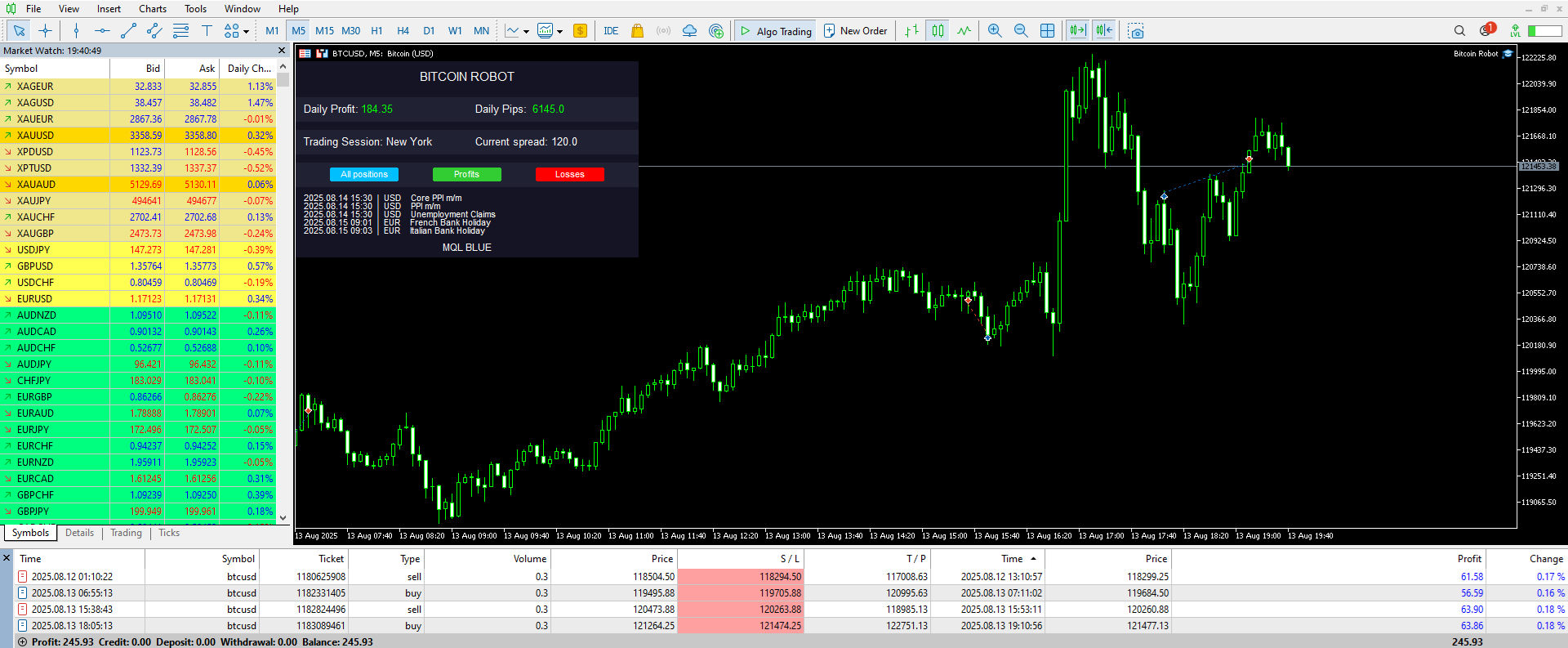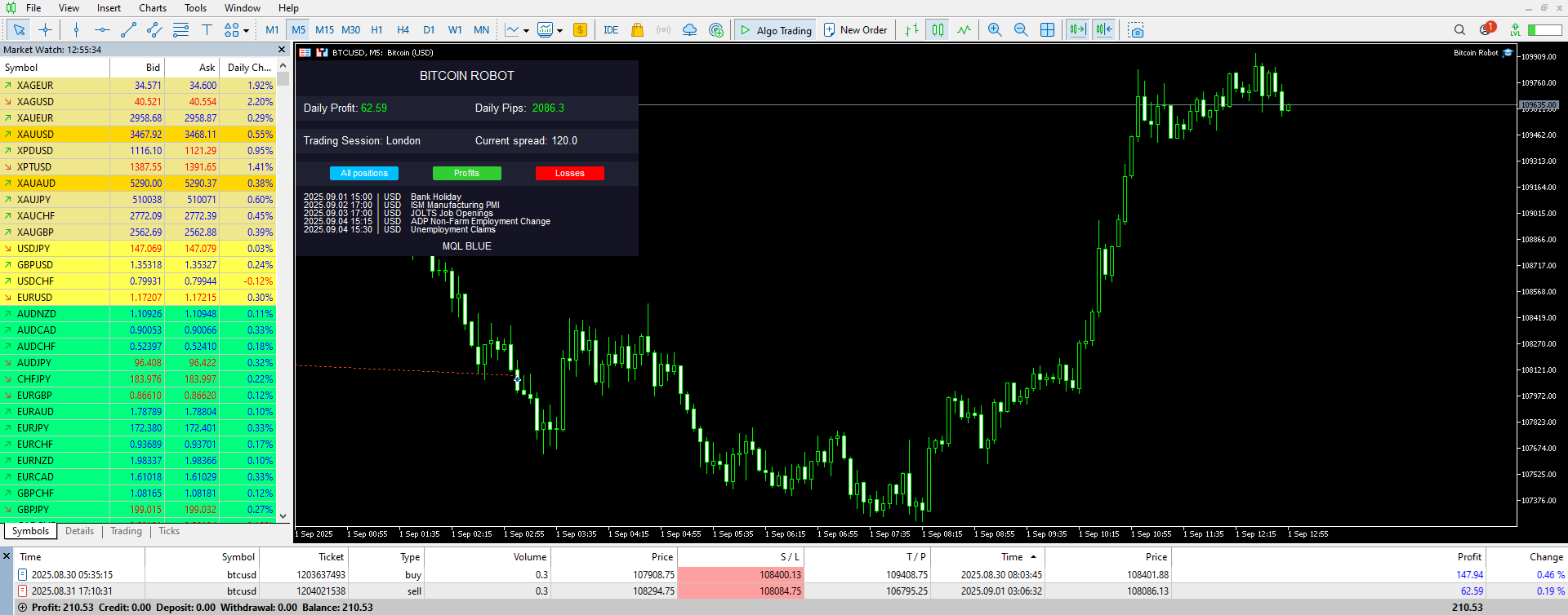 Bitcoin Robot is also protected during important news, when high-impact news comes out, the robot doesn't open positions before and after 60 minutes after the news.