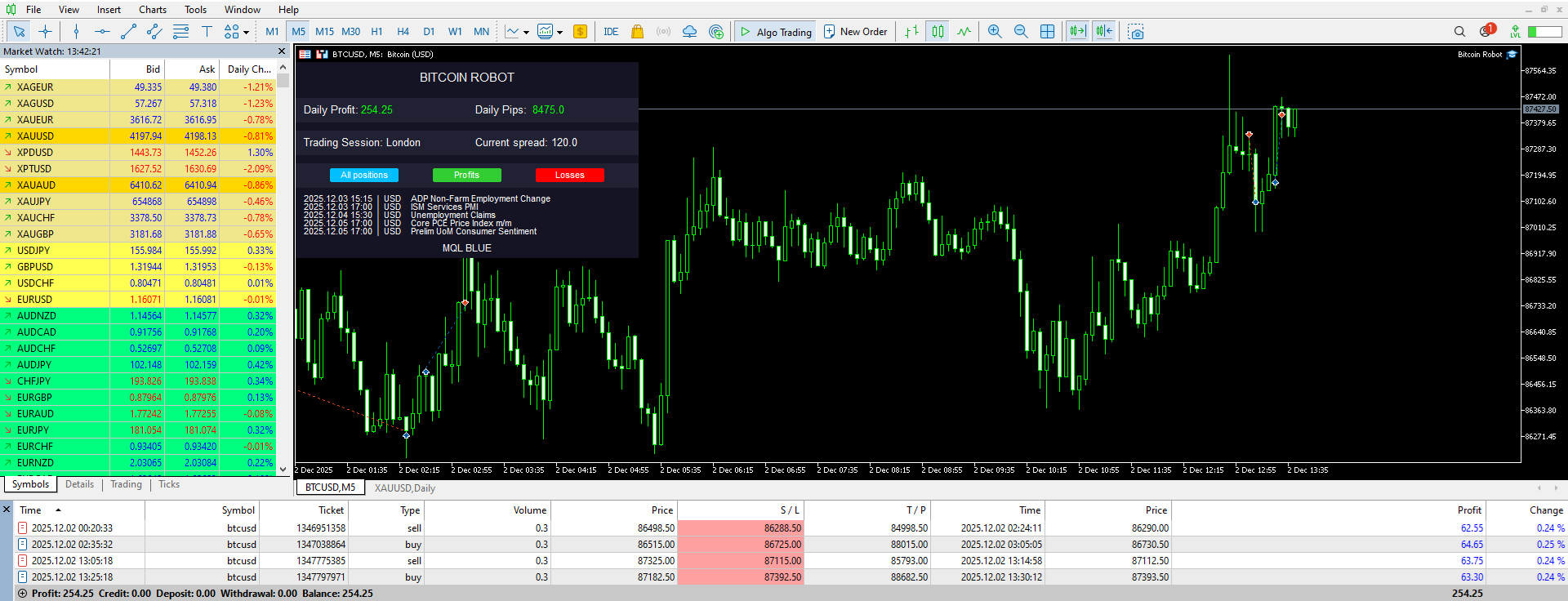 Bitcoin Robot is also protected during important news, when high-impact news comes out, the robot doesn't open positions before and after 60 minutes after the news.